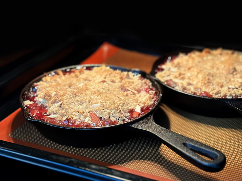 コブラーとは、イギリスやアメリカで親しまれている焼き菓子です。果物や塩味の具材を焼き皿に敷き、生地やビスケットをのせてオーブンで焼き上げます。